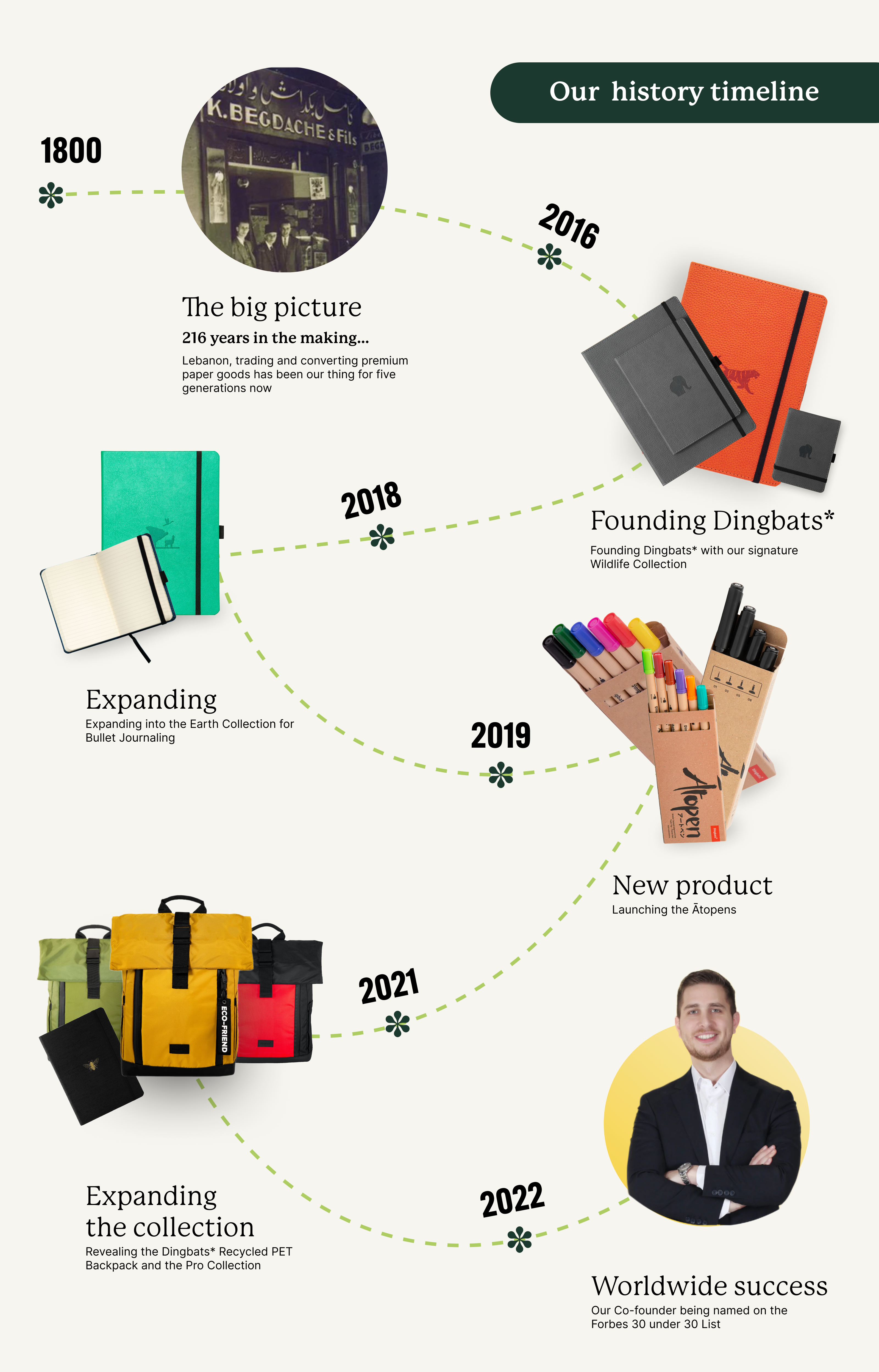Just happy to be part of something greater. Though the Dingbats* journey officially began back in March 2016, our passion stems from a long family tradition that proudly celebrates craftsmanship, quality and ingenuity. As part of SKB, the oldest established company in Lebanon, trading and converting premium paper goods has been our thing for five generations now (since 1800). And today, we still draw on this expertise in everything we produce; from top-quality notebooks to backpacks and pens.*We have a team in Beirut, UK, Belgium, Netherlands, US, Canada, Australia, New Zealand*