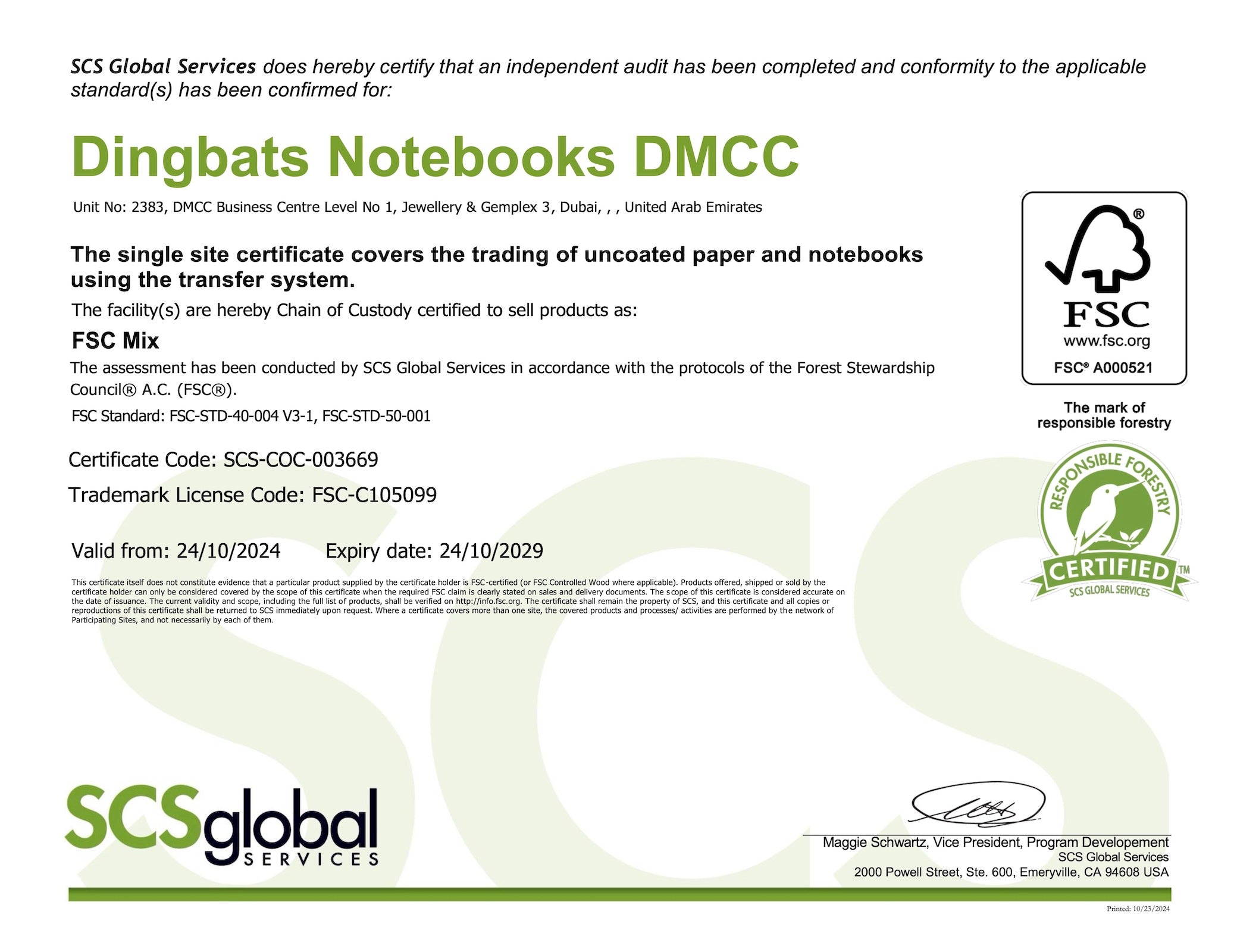 Our stylish faux leather covers are not just cute (though we say so ourselves), but non-toxic and fully degradable usually after 10 years. That is when the material is mixed in compost in controlled temperatures and environments. And the paper inside is just as green — your Dingbats* is made from trees that are replaced or allowed to regenerate naturally.